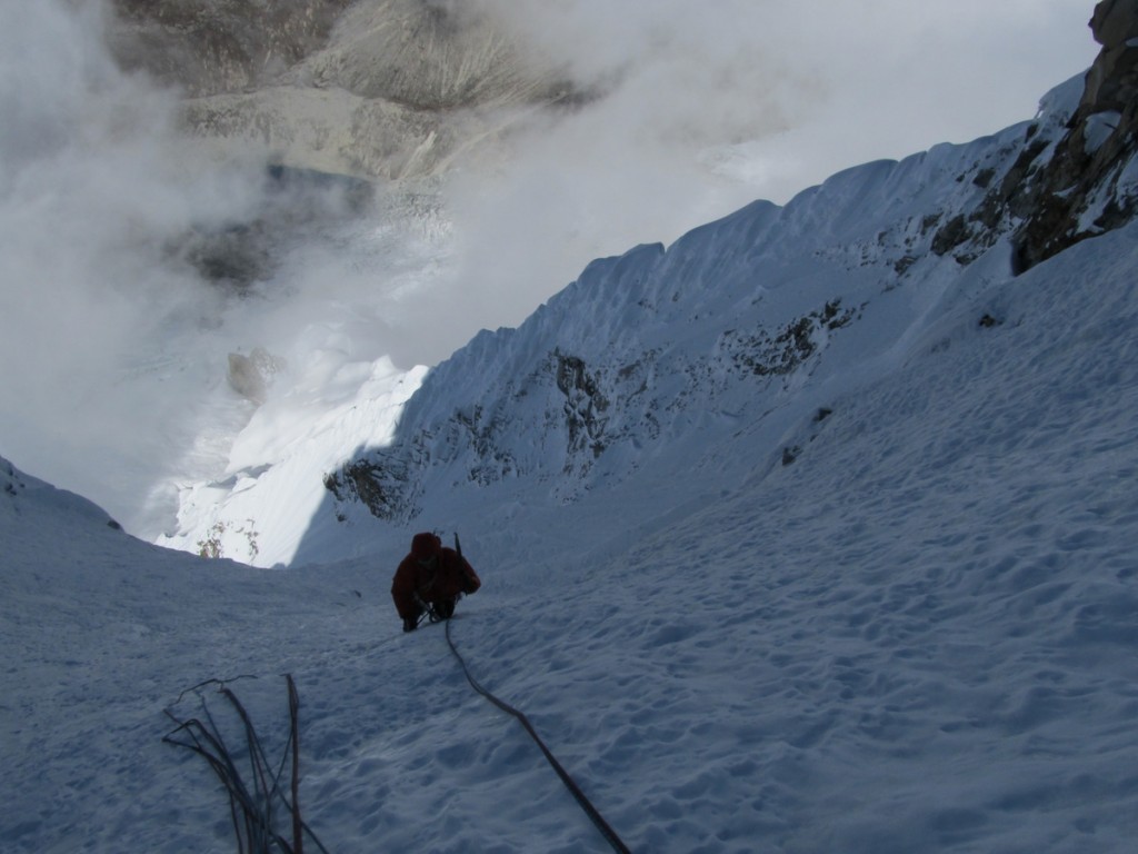 As I traversed left I had to cross the famous Andean flutings. These are thin, delicate ridges that separate snow runnels and can collapse at the slightest touch. With axes in last season's barely consolidated snow in the belly of the cornice I inched left. As fluting after fluting collapsed and drained into the couloir below I prayed I would find some solid ice to take a screw.